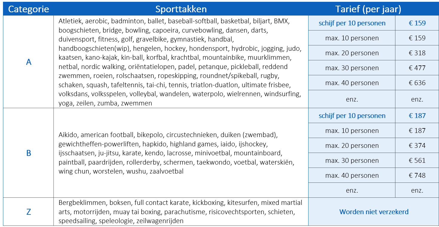 Aansluiten kan in schijven per 10 personen. Het tarief (per 10 personen) is afhankelijk van de sporttak die jouw club beoefent: