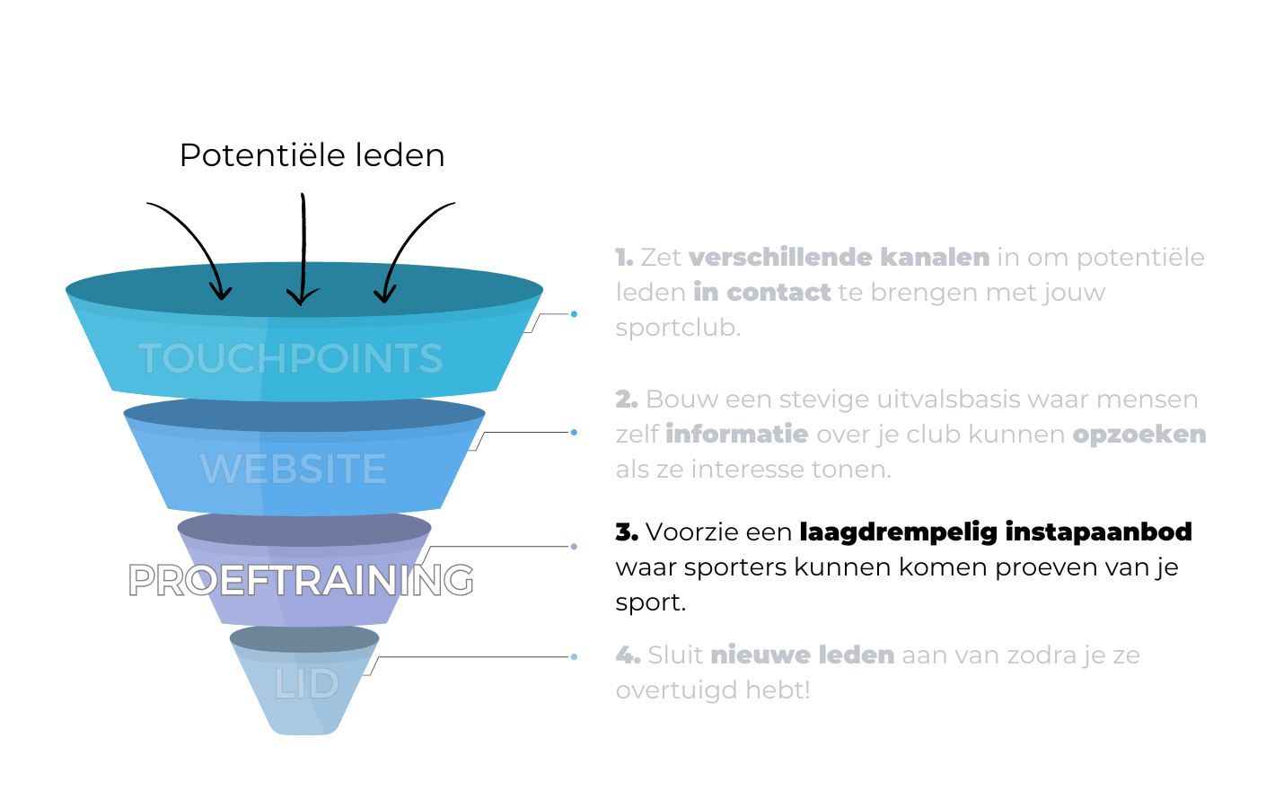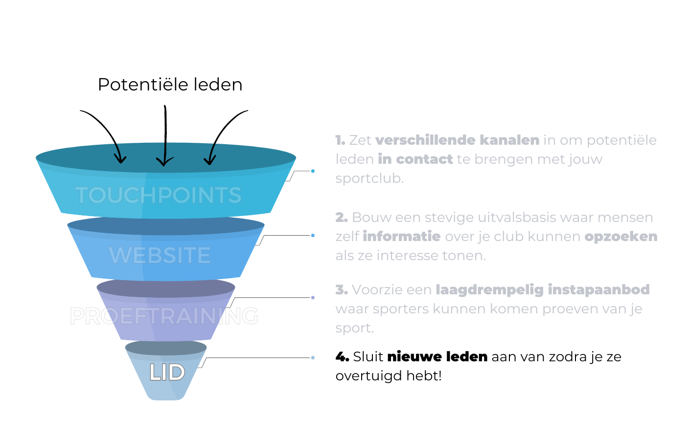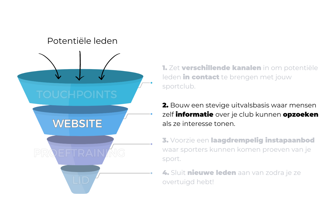 Aan de bovenkant van de trechter komen alle potentiële leden binnen, die een denkbeeldige reis doorlopen richting een lidmaatschap van je club. In elke fase worden ze stap voor stap enthousiaster gemaakt over je werking, met als doel zoveel mogelijk nieuwe leden onderaan uit je trechter te halen.